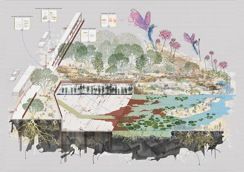 Tutor's Notes // The Inner Coast rethinks disciplinary and territorial boundaries—not least because Rifqi’s project provides a reflexive means to rediscover the coastline within island-city Singapore. It reclaims what is often considered extraneous to architectural making, and uses disciplinary tools to express ways of seeing, giving value, and intervening with at-risk and undervalued landscapes. At the Clementi Forest canal, Rifqi utilises a designer’s sensibilities of making patterns and speculative ideas visible by articulating site-specific particularities and species-specific fragilities. His proposition boldly advocates that architecture reconsider how it should deal with and re-value its own interventions and output within these sensitive sites.